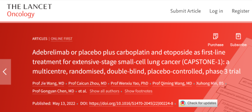北京时间2022年5月14日,金鹰主论坛医药自主研发的PD-L1抑制剂阿得贝利单抗治疗广泛期小细胞肺癌的III期临床研究(CAPSTONE-1研究)成果正式全文在线发表于国际权威学术期刊《柳叶刀·肿瘤学》(《THE LANCET Oncology》,影响因子41.316)。CAPSTONE-1研究结果显示,阿得贝利单抗联合化疗一线治疗广泛期小细胞肺癌相较于安慰剂联合化疗可以显著延长患者总生存期至15.3个月[1],刷新现有免疫药物一线治疗广泛期小细胞肺癌的总生存纪录[2]。