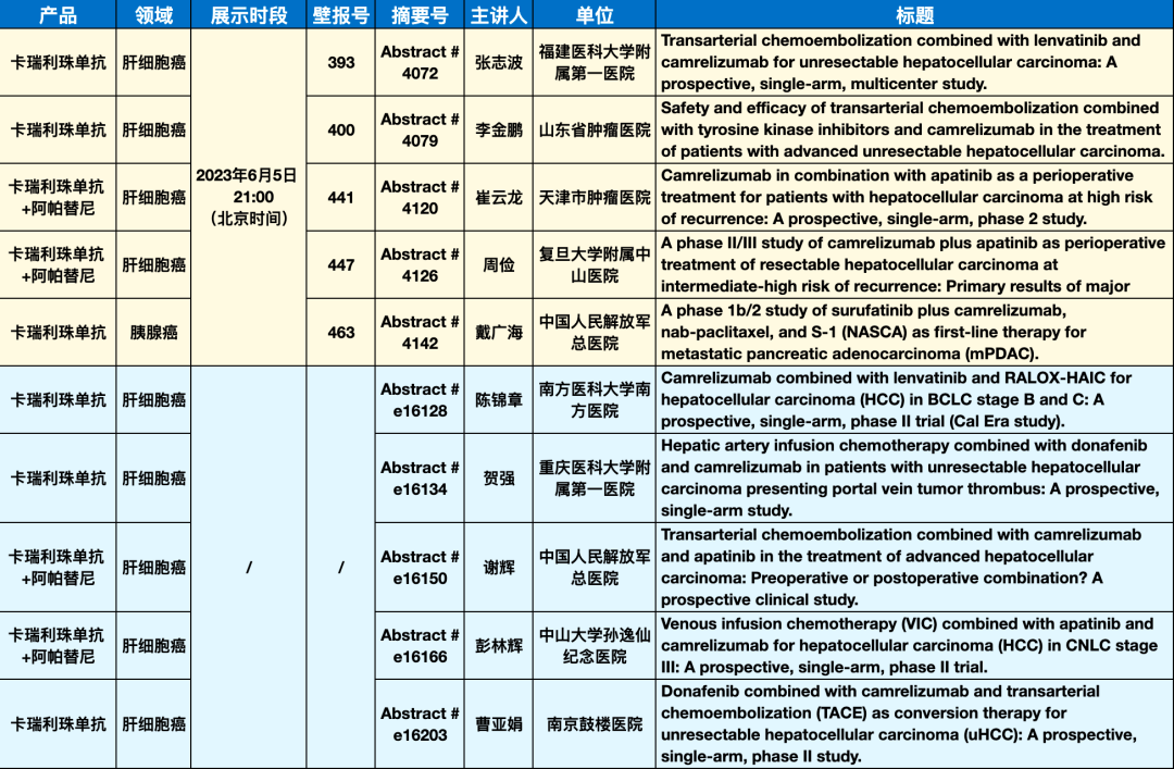 在肝胆胰腺肿瘤领域,卡瑞利珠单抗和阿帕替尼共有10项研究入选(包括5项壁报展示和5项线上发表)。