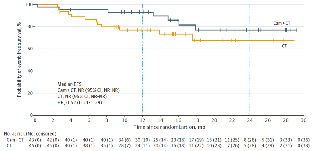 Cam+CT组和CT组末次新辅助治疗与手术的中位间隔时间分别为4.7周(IQR 4.0-5.6)和4.6周(IQR 4.0-4.9)。Cam+CT组的全肺切除术比率为10.0%,低于CT组的19.0%。Cam+CT组和CT组分别有92.5%、 85.7%的患者达到R0切除,未影响手术可行性。在Modified ITT分析集中,与化疗相比,卡瑞利珠单抗联合化疗显著提高了患者的pCR率(32.6% vs. 8.9%,OR=4.95,95% CI:1.35-22.37,P=0.008);同时也改善了患者的MPR率(65.1% vs. 15.6%,OR=10.13,95% CI:3.32-32.76,P<0.001)和ORR(72.1% vs. 53.3%,OR=2.26,95% CI:0.85-6.08)。截至2022年8月31日,EFS暂未成熟,Cam+CT组1年和2年的EFS率分别达到93.0%和76.9%,CT组则为76.9%和67.6%。
