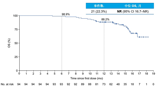 OS总生存数据尚不成熟,中位OS尚未达到(95% CI:16.7-NR),12个月的OS率为88.2%。